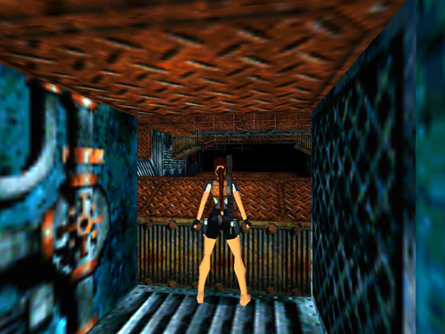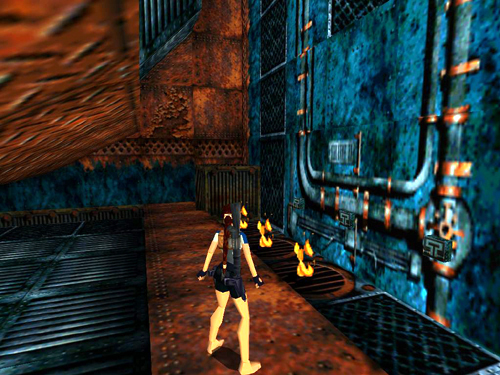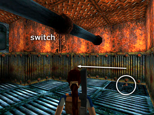 Kill the guy with the wrench (21) in the room above. Throw the switch to rotate the huge ducts in the next room. If you don't do this, Lara will slide off the ducts when she tries to climb across them. You want to make sure the rusty side is up. (screenshot)