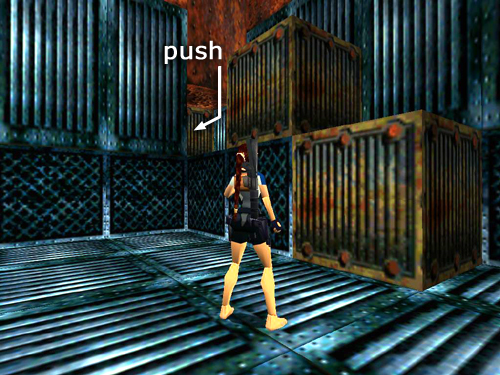 Go through the door you just opened to emerge back at the end of the hallway with the 5 doors. Use the key in the lock to open the door next to it. Drop into another small room with movable blocks. Move the block in the corner next to the metal ledge. Then climb onto the ledge and pull the second block out from the wall twice so you can enter the area behind it. Push the third block you find there to open up a passageway. (screenshot)
