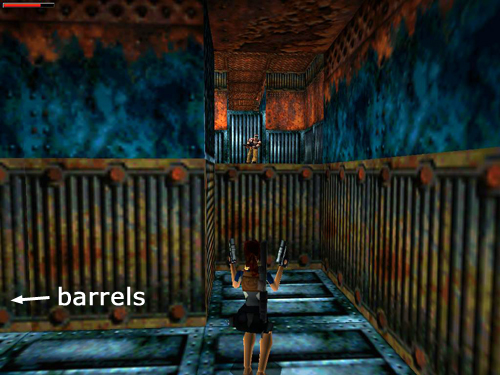 Hop down, return to the bottom of the slope where the barrels landed and turn right. In the dark corner ahead is a raised opening. If you like you can shoot the gunman (12) inside by getting a lock on him with pistols and jumping straight up and down while firing. (screenshot) When he falls, climb into the doorway.