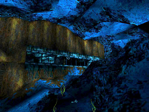 UNDERWATER TUNNEL: The tunnel leading to the end of the level is hidden behind the rock formation to the left of the barrels on the sea floor. Swim down behind those rocks and forward through the dark passage. The yellow eels that inhabit this tunnel are actually hazards more than enemies since you can't damage them. They try to bite Lara as she passes but don't do too much damage as long as you keep moving. Turn left into the narrow passage just in before the first eel, then turn right just before the second eel. After this, the rocky passage slopes upward. Swim straight on through the opening where the third eel is floating. (screenshots)