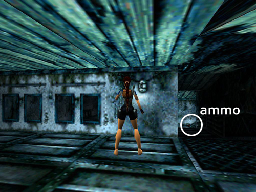 Go around to the right side and drop down through the square hole at the edge of the floor to land on the flat ledge below. Most of the other tiles around the edge of the pool slope downward, so if Lara lands on them, she'll slide into the water or, worse, the broken glass. Take the M16 clips and small medi pack (37-38) from the goons, and retrieve 3 sets of M16 clips (39-41) from the dark alcove. (Both the alcove and the spot where you drop down from the upper level are shown in the previous screenshot.)