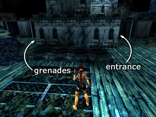TOP AND UPPER-MIDDLE DECKS: Climb down from the tunnel opening onto the deck. Head straight forward into the alley between the two cabins. (screenshot) Ready weapons. As you pass the small doors that face each other, 2 enemies (16-17) appear just ahead. One has a wrench, one a shotgun. Backflip while shooting to take them both out before they reach you. One drops a box of flares (15). Continue forward between the walls and turn left. Hop down into the depression just to the left of the ornate bench to find 2 pairs of grenades (16-17). Then continue toward the front of the deck.