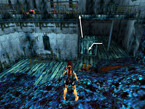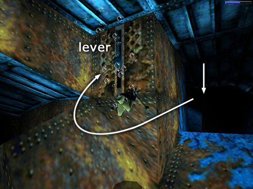 When you first enter the stern, it's partially flooded. Jump into the water, swim down and forward, then make a sharp U-turn to the right. You'll see a lever on the wall. (screenshot) Pull it to open a trapdoor elsewhere. Swim back the way you came, exit the STERN, turn right and head back to the rusty ledge with the trapdoor, where you killed the guy with the flamethrower earlier. A thug with a shotgun (7) meets you there. Kill him and take his shotgun shells (6) before dropping down through the trapdoor. (This is not the door you just opened with the lever; it opens automatically when Lara stands on it.)
