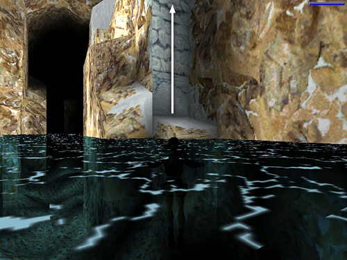 Follow the tunnel to a small, water-filled hole and icicles on the ceiling beyond. Walk to the edge of the hole, hop back once and then jump forward to grab the top of the icy ledge. Or, drop into the water and climb the ice wall from below. Pull up onto the ledge but don't step forward until after the icicles have fallen; otherwise Lara will be impaled. (screenshot)