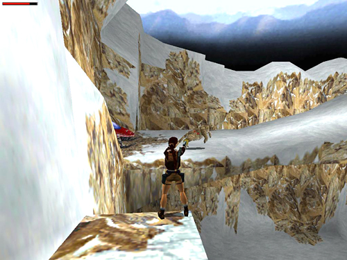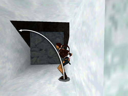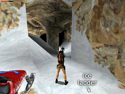 First, the shortcut: Move the snowmobile into position facing the ramp in the middle of the clearing. The tunnel and the smaller opening where you just climbed up to move the ice blocks will be on Lara's left. Save the game here. Then if you miss the first jump, you can just reload and try again. Ride up the ramp diagonally so you take off at the top right corner. (I found it easier not to use the turbo boost for this jump.) Steer just a little to the right while in the air to land on the jagged ledge facing the right cave wall. Then drive forward into the wall to avoid slipping off the other side of the ledge into the trench. Once you've landed safely, save again. Carefully turn the snowmobile around so it's facing the tunnel opening. Race forward along the jagged ledge, holding Action for a speed boost to clear the gap in the ledge, race up the ramp at the end and sail into the tunnel opening. (These screenshots show the whole sequence.)