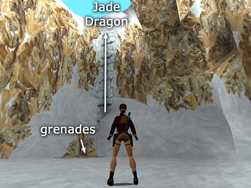 NOTE: If you look down into the canyon below the ledge where the Jade Dragon was, you can spot some grenades in a shallow pit. Ignore them for now. You'll be able to get them more easily from below in a few minutes.