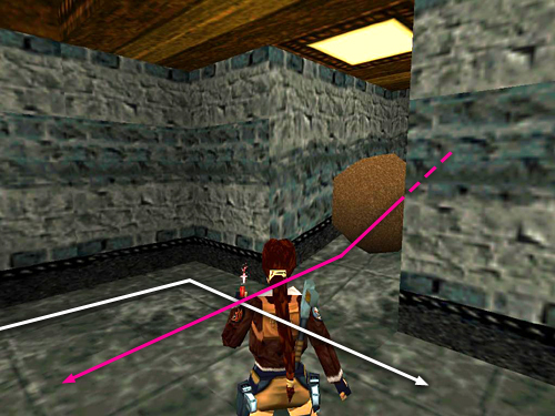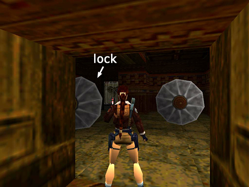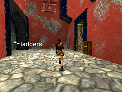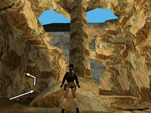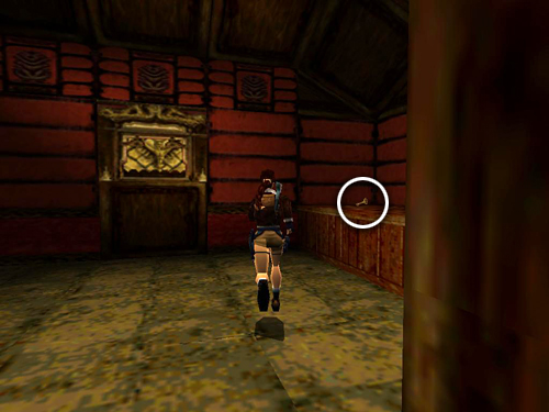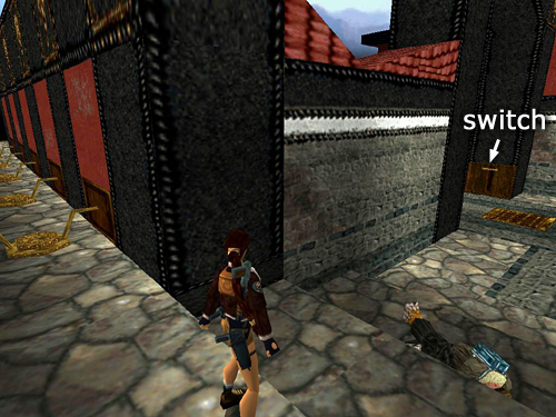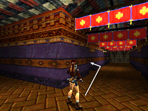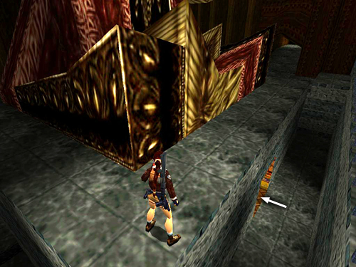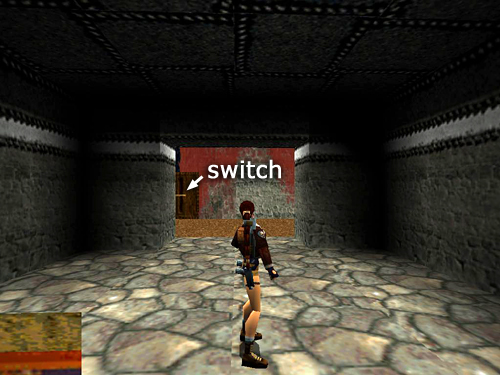 BUG NOTE: If you're playing the Windows PC game and have used the Tomb Raider multi-patch from tombraiderchronicles.com, you may find you're unable to side flip here. Instead Lara hits an invisible barrier just below the visible ceiling. If this happens, use the switch and then just turn and run. Or uninstall the game, reinstall without the patch, and try setting the program compatibility mode following the instructions here.