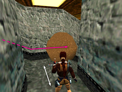 Step down into the small room with gray stone walls. Run past the doorway and wait in the corner for a huge boulder to roll past. (screenshot) Follow the ramp up to a T intersection. Step forward into the hallway, then quickly hop back to avoid another boulder. (screenshot) Pick up the flares (10) and head up to the left.