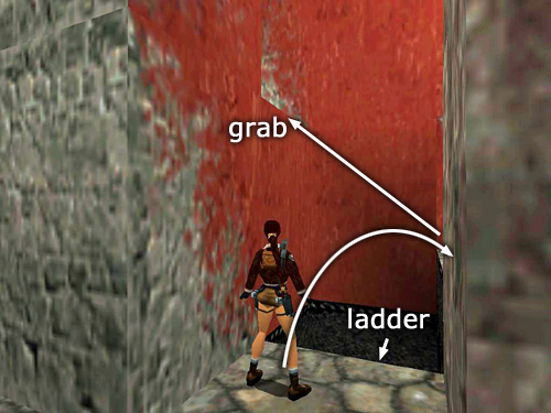 NOTE: Normally holding a flare while jumping and grabbing is not a problem; however, when jumping from the high alcove to grab the statue's hand, Lara may not grab correctly if she's holding a flare. If this happens, reload, drop the flare and try again.