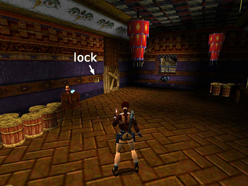 Beyond the burners, turn left and go down the steps into a courtyard with several golden trapdoors. A pair of thugs (14-15) come in behind you and start fighting with the monks. Finish off the bad guys if the monks fail, and take a small medi pack (19) and some Uzi clips (20) off the bodies. Climb the ladder on the right side of the courtyard to retrieve some M16 clips (21) on the ledge above. Drop back down into the courtyard and pull the switch to open two of the trapdoors. (screenshot) Drop into the room below, shoot out a window and take the 2 GEMSTONES (22-23). On the other side of this room is another switch. Use it to open the other trapdoor so you can climb out.