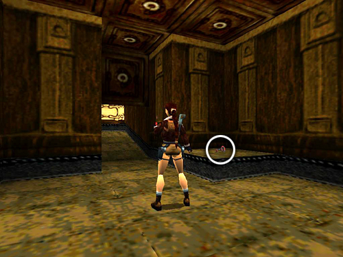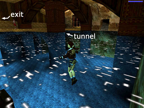 POOL WITH STRONG CURRENT: At the top of this hallway is a room with a pool. Save the game in the doorway. Then dive in and swim along the right wall, then the far wall, then into the small opening near the far left corner. Or, hang from the edge of the doorway, drop into the water and swim along the near wall, then the left wall, then the left side of the far wall to the opening. This way is a little longer but the current is not as strong on the far side of the room. (screenshots) As you swim along the edge of the pool, it's crucial that you stay near the wall and not swim too close to the surface or the bottom; otherwise the strong current will draw Lara toward the grate at the bottom of the pool and she'll drown.