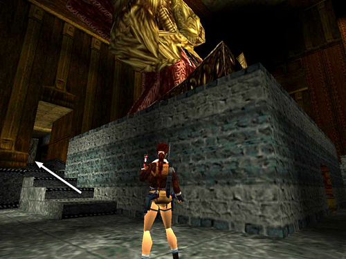 MAIN HALL - ON TOP OF THE STATUE: Cross the room and enter the second door on the right side when facing the statue. Climb the ladder and follow the hallway to an opening overlooking the statue. If Lara is holding a flare, drop it now. Then take a running jump to grab the lower of the statue's two extended hands. Pull up and climb onto the upper hand. From there, take a running jump to grab the head. Pull up, cross the head, then jump onto the other raised hand. Walk to the edge, take a standing jump to grab the alcove above and pull up. (Holding a flare here should not cause a problem.) Place the second GEMSTONE in the niche to open a trapdoor in the room underneath the statue. (screenshots)