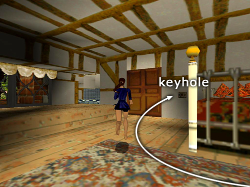 DARK ANTEROOM WITH MANY PILLARS: There are 6 cult members (6-10) lurking among the pillars. You can draw them out two at a time by advancing slowly into the room with weapons drawn. As soon as the first two emerge from hiding, back out of the room and jump from side to side while firing to avoid their throwing daggers. (screenshot) Uzis work well here, and you'll have a chance to pick up more ammo afterward. Repeat the same strategy for the next pair of enemies. For the last two, advance farther into the room and fight them as they appear. When they're all dead, recover their stuff: large and small medi packs, 6 sets of Uzi clips (4-11), and a MYSTIC PLAQUE (12). Use the Plaque in the receptacle beside the gate to open it. Go through, follow the hallway to a short ramp and slide down into the Dragon's Lair.