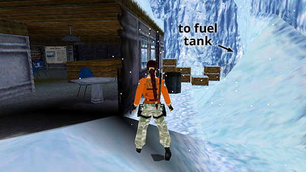If you want secret #3, get back in the boat and maneuver it so it's facing away from the ledge with the red flag and its right side is touching the ice wall. Save the game if possible. Jump out of the boat on the left side, swim down into the little alcove below the ice shelf, grab the HUT KEY (28), roll, swim to the surface, and quickly climb back into the boat before Lara freezes to death. Now drive away from the ledge with the red flag and back toward the GATEHOUSE. Turn right there and follow the channel back to the WOODEN HUT in the starting area. Drive past the back of the hut, park the boat near the low ledge on the left, and jump out. (screenshots)
