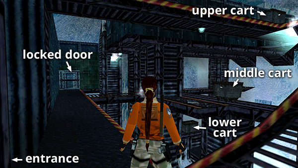 MINE CART JUNCTION: There are 3 mine carts here, each of which runs on a separate set of tracks. (screenshot) You can ride either the lower- or middle-level cart first, but the upper level should be done last since it requires items found on the other levels. To minimize backtracking, and because the middle level is a little easier, I recommend going there first.