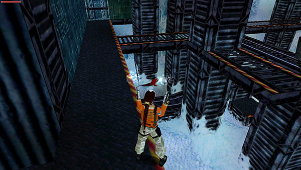 Before starting out, shoot the mutant (3) lurking below on the left. (screenshot) Also notice the padlocked door at the left end of the walkway near the entrance. The CROWBAR does not carry over between levels, so you'll need to find another one to open this door. (screenshot)