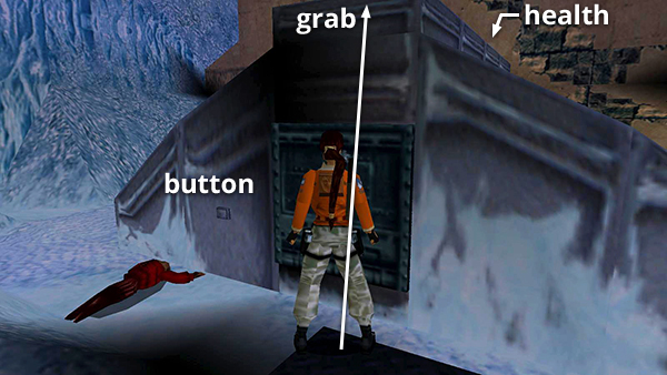 If you're going for all the secrets, you'll need to do some climbing. See the small, rectangular opening high on the wall? That's where you're headed. Run over to the low snow ramp against the wall below and to the right of the opening. Walk to the top of the ramp, stand at the left side and grab the nearly invisible horizontal crevice in the ice wall. (Press Action + Forward to grab it, no need to jump.) Traverse to the left and pull up into the crawlspace. Press the button there to open a door in a little room back at the JUNCTION. This will enable you to access secret #2 when you return there. Crawl back out and drop down. (screenshots)
