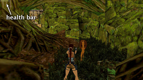 If Lara gets too close and either snake bites her, the health bar turns yellow and begins to flash and gradually diminish. (screenshot) Use a medi pack to neutralize the poison. If you know you'll be meeting several snakes in a row, as you do here, you may want to wait until you've killed them all before using the medi pack. Just keep an eye on Lara's health. As always, if it runs out, she'll die.