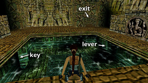 PlayStation gamers may want to get the save/power-up crystal (5) on the other side of the pool and use it before attempting to get the key. If you're playing on the PC or Mac, you'll probably want to save the crystal until afterwards in case you lose some health in the process. Don't worry about the statue near the crystal. It doesn't come to life.