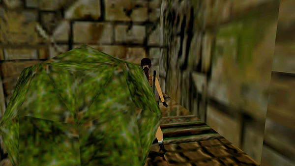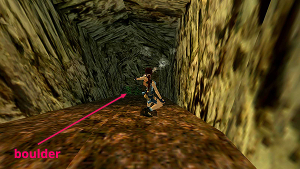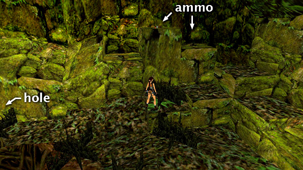 Just around the corner is a shallow pit containing a small medi pack (15). This is a boulder trap. The boulder doesn't move until you actually step into the pit, but once it lands there, it prevents you from getting the medi pack. So walk to the edge, step off into the pit, and immediately press Action to grab the medi pack. Then quickly jump forward out of the pit before the boulder arrives. Or, once you have the medi pack, run forward and stand against the wall of the pit. The boulder will then land behind Lara without squashing her, and you can then climb out safely. (screenshots)