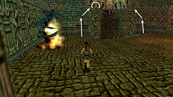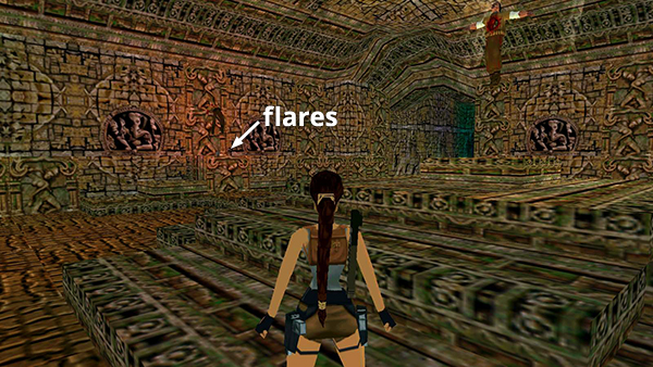 Now make your way carefully around the room, avoiding the darts and picking up flares, shotgun shells, and another small medi pack (16-18) from the various alcoves. Return past the darts to the pit with the switch and movable block. Then climb back up into the room with the large gate, where you defeated the guardian statue.