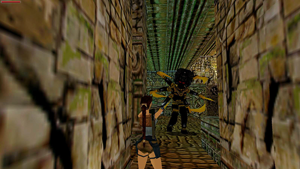 BUG NOTE: If you encounter an "invisible wall" blocking this passageway, you may still be able to go on. This bug is apparently triggered by saving in the room with the first six-armed statue (i.e., the statue that doesn't animate) or returning there after the first time. If you're playing the PS1 game, restart the level and avoid doing that next time. If you're playing the PC or Macintosh version, either reload a save from before that room and try again, or download a bug-free save file.