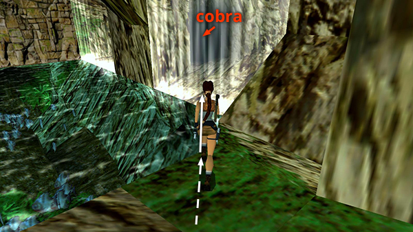 From the starting position, step forward and turn right. Go through the opening in the tree trunk and pick up a small medi pack (1). Draw pistols and walk forward slowly. A cobra (1) will rear up from the undergrowth. Shoot it before trying to pass. Continue walking forward through the greenery. A second cobra (2) pops up. Shoot it as well.