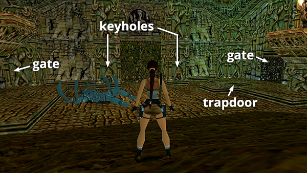 IMPORTANT: At this point, it normally doesn't matter which path you take first. You'll need to go both ways eventually in order to find the two keys that open the large gate. However, because of potential bugs, if you are playing on the PS1 or have not installed the PC patch, I recommend exploring the side areas in the order described here. Then if you encounter one of the invisible wall bugs on the way to the first key, you can reload an earlier save or restart the level and not have to replay as much.