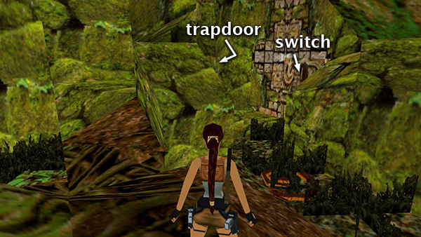 NOTE: If you just can't manage the quick timing here, try this: After pulling the second switch, immediately side flip to the right into the trapdoor. Use a medi pack in flight to minimize the damage from the spikes.