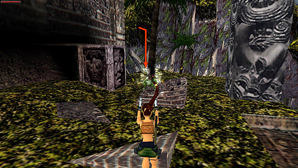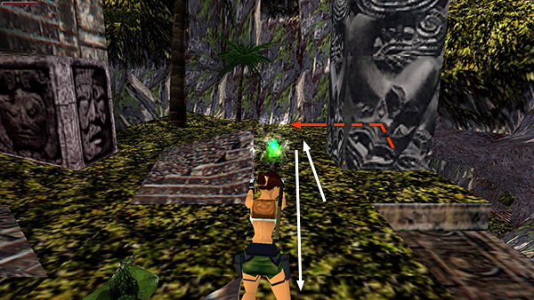 LEFT CHANNEL: First you'll go over a red tripwire that activates a poisoned dart trap. The darts sail over Lara's head though, so they won't harm her. Next, you'll go over a green tripwire, which causes a save/power-up crystal (8) to appear on a block just below in the middle of the river. You'll retreive it shortly. (screenshots)