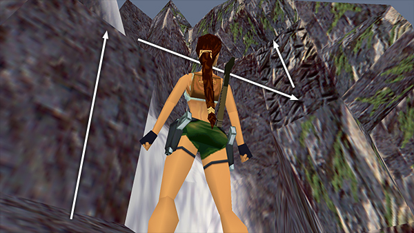 Take a running jump from the block to grab the sloping ledge on the other side of the river. Traverse to the right until you can pull up. Turn right and pull up onto the higher block. Walk to the outer corner and take a standing jump down to the triangular ledge ahead. Then take another standing jump up to the next triangular ledge. Walk up the slope to the next triangular ledge. Angle Lara to the left, sidestep to the outer corner of the triangle and jump forward onto the ledge around the corner. (screenshots)
