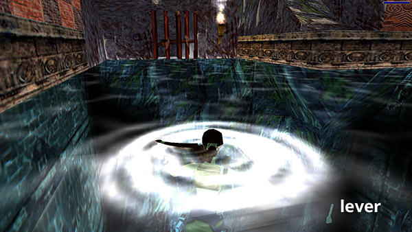 KAYAK ROOM - HEADING DOWN RIVER: Kill the 2 crocodiles (8-9) in the pool from the ledge. Then jump into the water and pull the underwater lever to open the wooden gate. The lever is below and to the right of the gate when facing it. (screenshot) Swim over to the kayak, face it, and press Action to get in. Now get ready for some white-water action.