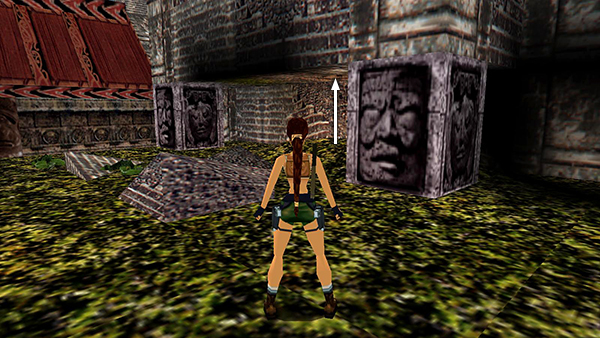 SHORTCUT - ACROSS THE RIVER AND BACK AGAIN: There is an opening under the overhanging ceiling of the building on the left, but you'll need to do a little bit of business before going inside. So ignore it for now. Instead, go around the second carved column and drop down onto the square ledge where the second lizard came from. Turn left and climb down two ledges to a flat spot overlooking the river. Take a few steps back from the edge, then a standing jump onto the square block in the middle of the river. Don't let Lara fall in or she'll be killed in the rushing rapids. (screenshots)