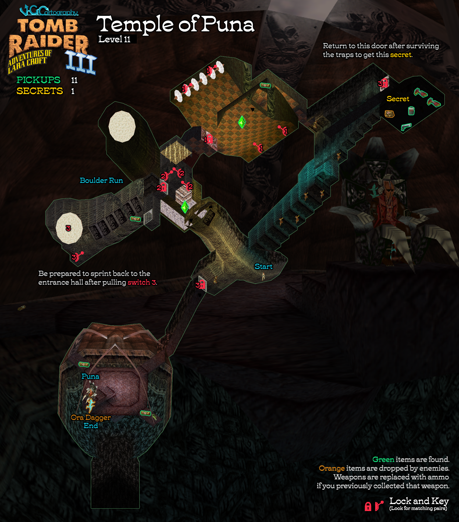 Secrets: 1 Pickups: 11, including the Ora Dagger artifact Kills: 9+ Save/power-up Crystals: 2