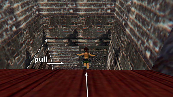 NOTES: The order in which you press the buttons doesn't matter. I recommend going clockwise or counterclockwise around the room starting and ending with the buttons farthest from the entrance. Also, it's not necessary to crouch if you're standing exactly on the seam, but if you're even a little bit off to the left or right, the "axle" of the blade can hit Lara unless you crouch. The corners of the room are safe as well, but they're not as close to the buttons.