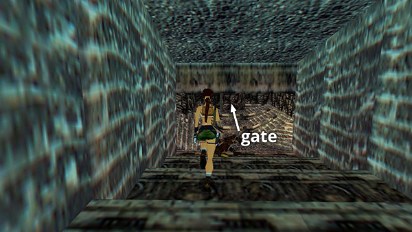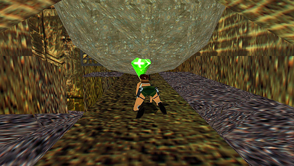 CORRIDORS WITH GIANT BOULDERS: Enter the next area, pick up the small medi pack (2), and go left. Pull the switch to open the gate at the opposite end of the room and arm the boulder trap. (Doing so also closes the gate where you came in, lights a flame in front of the entrance, and reveals trenches filled with some kind of freaky yellow lava on either side of the walkway.) The boulder doesn't roll until you pass over the tile in the middle of the walkway. To avoid being squashed, sprint along the walkway toward the gate. Continue running but release the sprint button as you approach the doorway. Briefly press Look to get Lara's perspective back as you veer to the right onto the perpendicular path. A second humongous boulder begins to roll down behind you. Tap Look again so you can see where you're going, but keep running, staying in the middle of the walkway to snag the save/power-up crystal (2) and avoid the breakaway tiles above lava on either side. When you reach the low archway with the step down, you're safe. If you missed the crystal, turn around and crawl under the edge of the boulder to retrieve it. (screenshots)