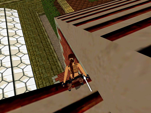 To get onto the balcony outside Lara's bedroom, first use the corner bug to get up onto the roof. Then head for the back left corner. Move to the edge overlooking the monkey bar portion of the assault course. (screenshot) Turn around so Lara's back is facing the wooden support for the monkey bars and the brick chimney is on her left. Slide back and grab the edge of the roof. Let go to land on the angled cement ledge below and slide down onto the balcony. To get down from there, take a running jump over the railing to land in the pool below or use the fence bug: aim just to the left of the corner of the railing and run forward, holding Action. Lara should run through the railing and land safely on the ground below. (screenshot)