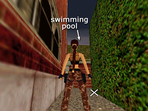 ASSAULT COURSE & SHOOTING RANGE: As in Tomb Raider 2, there's an outdoor training area around the back of the mansion. To get there, exit through the front door, go to the left past the statue of the prancing horse and around the corner of the house. Follow the alleyway between the house and the tall hedge around the glass-domed swimming pool. When you approach the beginning of the course, the voice-over explains what to do.