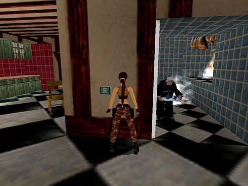 The DINING ROOM and KITCHEN are also off the MAIN HALL (to the left of the grandfather clock). The button on the DINING ROOM wall turns on some music. The light brown door looks inviting but doesn't open. The button in the kitchen opens the walk-in freezer. If you like, you can lure Winston, Lara's trusty though flatulent butler, inside. Then run out and press the button to lock him in.