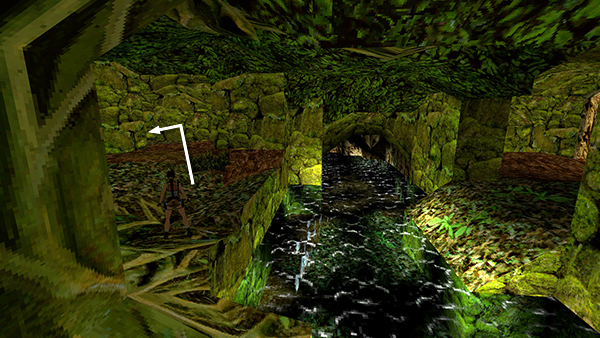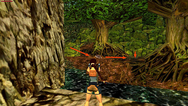 IMPORTANT: Be sure to save the game and then save again in a new slot before jumping across the river, in case you are unable to get back. Do not overwrite the original save until you finish exploring the ruins and return to this point. Then if you get stuck on the other side of the river, you can reload the earlier save and continue from the GREEN CAVE. You won't have everything, but at least you'll be able to get all the secrets and move on. If you forget to do this, you'll have to restart the level or download a different save file (Follow these links for classic and remastered saves.)