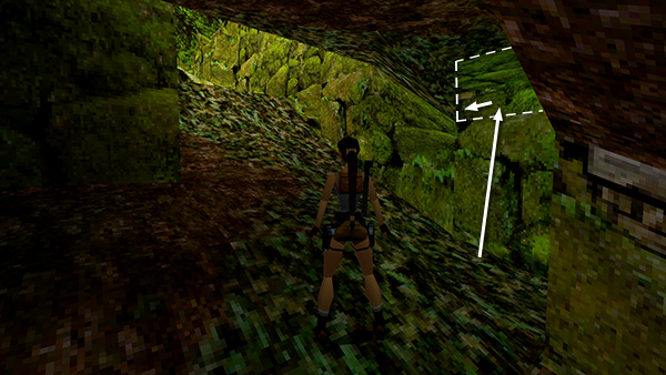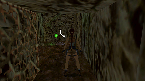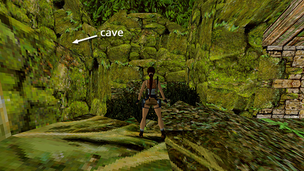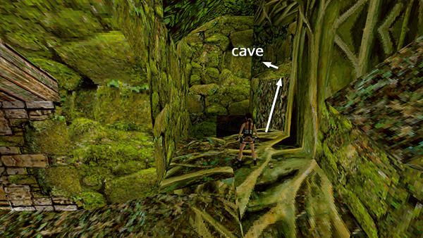 Now continue beyond the top of the slope. (A wide corridor leads off to the right. This is where you would drive the quad bike if you took the normal route through the RUINS. You can ignore it.) In the far left corner is a raised opening leading into a small cave. Inside you'll find flares and Uzi ammo (24-25). (screenshot) Exit the cave, turn right, and return to the top of the slope.