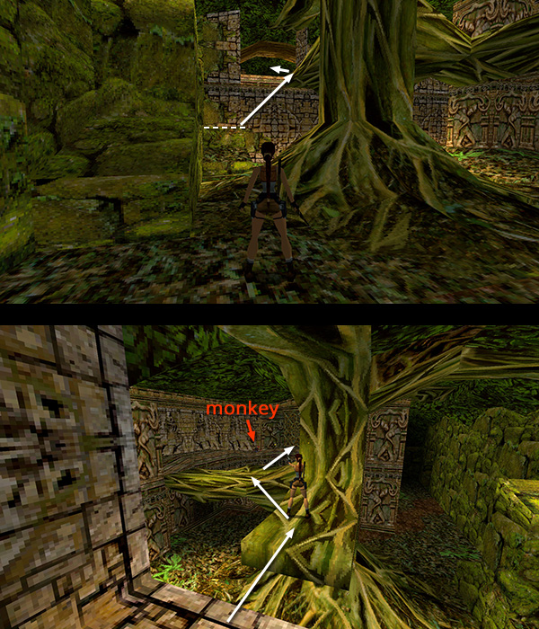Enter the ruins through the opening ahead. (screenshot) As you follow the wide passageway into the ruins, roll and shoot 2 monkeys (13-14) that try and sneak up from behind. Turn around again and proceed into the COURTYARD WITH THE LARGE TREE AND TWO-STORY BUILDING. Head for the far left corner. Climb onto the rocks and jump to grab the jutting tree limb. Pull up. Then jump into the wide, manmade opening on the left to trigger the appearance of another monkey (15) on the upper level of the two-story building. Turn around, jump back to the tree branch, kill the monkey, then jump across the branches to the doorway on the upper floor of the TWO-STORY BUILDING. (screenshots)
