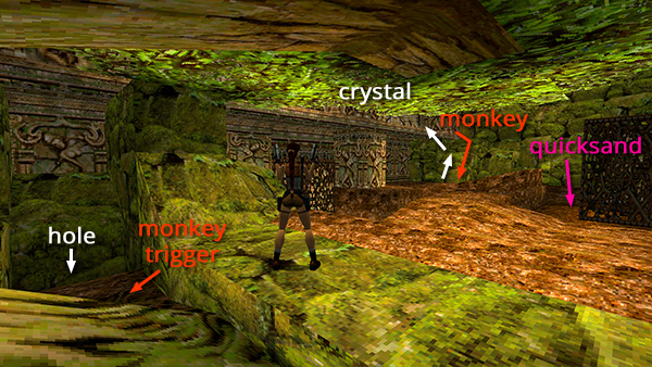 Drop down into the OUTDOOR AREA WITH QUICKSAND POOL AND TWO GATES. There are 2 more monkeys (26-27) here. One comes down from the ledge with the save/power-up crystal (above the closed gate) as you approach. The other is triggered when you stand near the hole in the ground in the left corner, near the tree where you came down into this area. Shoot both monkeys, get the crystal, and drop down through the hole. (screenshot)