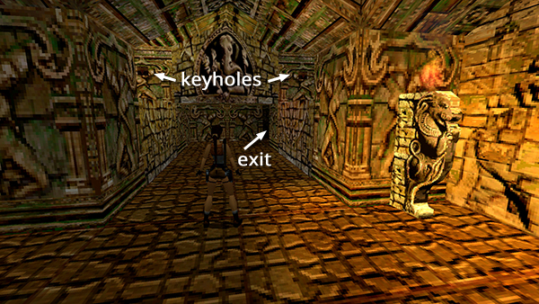Continue through the L-SHAPED ROOM WITH LIT TORCHES AND TWO KEYHOLES. At the far end, ignore the 2 raised alcoves with the keyholes again and go through the opening on the right. (screenshot)