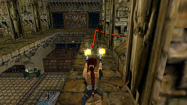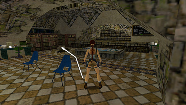 Enter the bookshelf area and walk into the alcove on the right (red arrow 1 in the screenshot). Stepping here opens the secret door on the far left. Turn around and walk out of the alcove, keeping the freestanding bookcase on Lara's right and the outer shelves on Lara's left (arrow 2). When you step on the floor just outside the secret panel, you'll hear the other panel open. Turn around and retrace your steps toward the alcove (arrow 3), but instead of entering the alcove, turn left and go through the second secret door.
