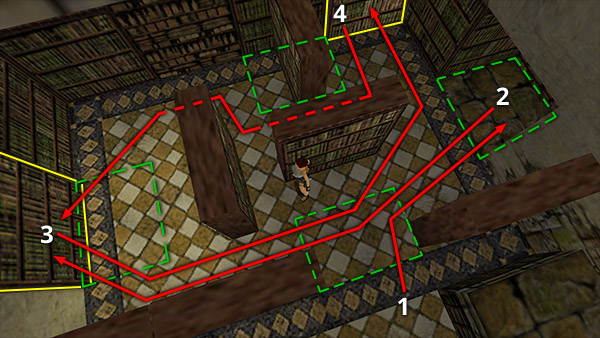 BOOKSHELF MAZE WITH SECRET DOORS: Go back out to the library and cross the room to the opposite corner, where you'll find a series of bookshelves arranged to form a small maze. (screenshot) This area involves three secret doors disguised as bookshelves, which open and close when Lara stands in certain spots. The text tells how to get through this area, but this screenshot is probably easier to follow. Lara's path is marked in red, the secret doors are outlined with solid yellow lines, and the pressure pads on the floor that open and close the secret doors are outlined in broken green lines.