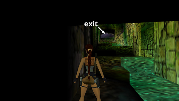 The exit is just below the ledge where you stood while shooting at the dog. Crawl through to avoid the spike traps that spring from the walls. There's one right before the small medi pack (6) (screenshot) and another just around the next corner. Once you've passed the second spike trap, you can safely stand.