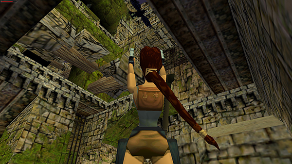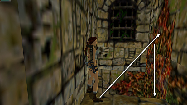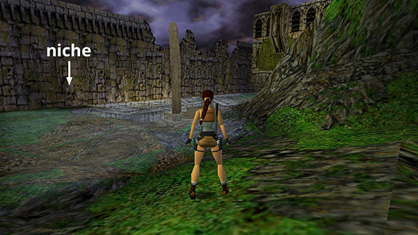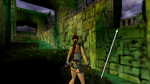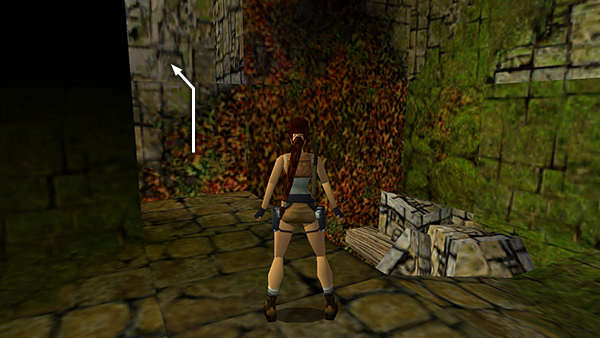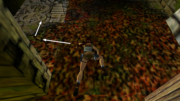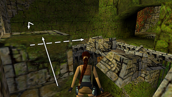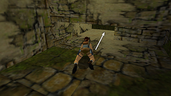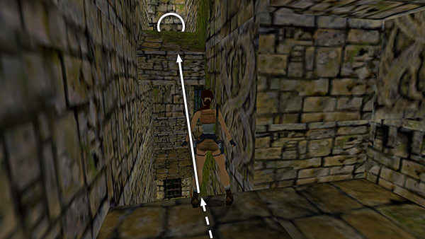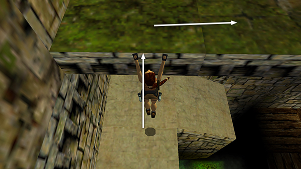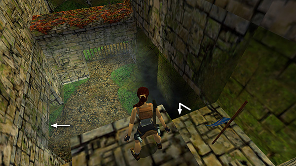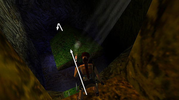 TALL, NARROW HALLWAY WITH LEDGES AND SPIKES: Turn left and take a running jump over the opening in the floor above a set of spikes to land on the green ledge ahead. (screenshot) Vault up onto the ledge ahead. Walk forward to the edge. Then carefully position Lara at the left side of the ledge angled to the right. Take a standing jump to grab the vine-covered wall. (screenshot) Climb down almost to the bottom. Then climb as far to the right as possible. You'll notice Lara's shadow falls on the seam in the floor between the tile with the spikes and the safe one next to it. If you drop down here, Lara won't take any damage. (screenshot)