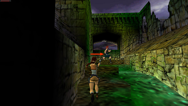 Stand facing the wall and press Action to place the CAIRN KEY in the niche. When you do, 3 Highlanders (11-13) appear to beat on poor Lara. Roll to face them and start shooting. (screenshot) After defeating them, return through the break in the wall to the RADIOACTIVE STREAM. Continue up the stairs. Another warrior (14) charges out of a doorway ahead on the left when you near the top. (screenshot) Kill him before he can knock Lara into the green goo.