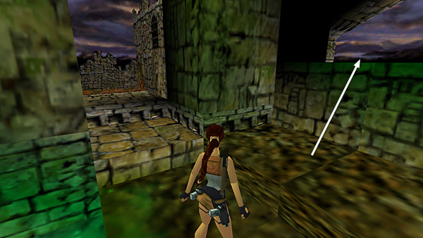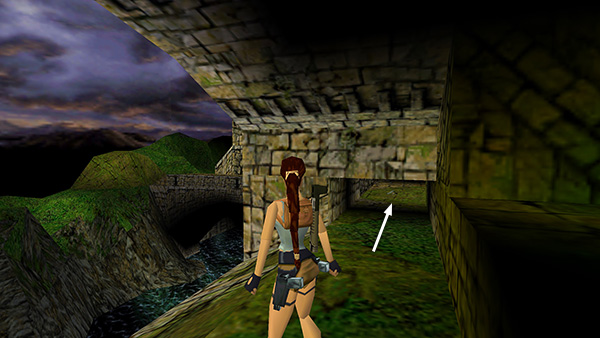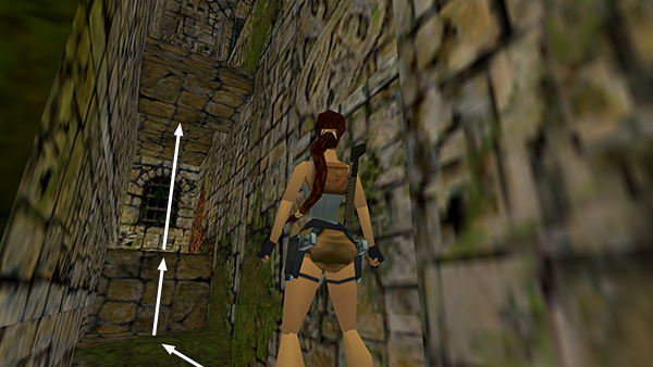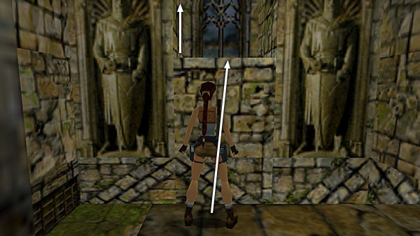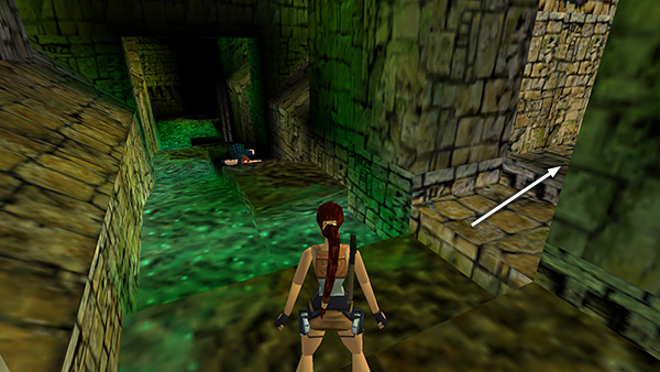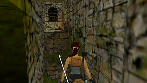 ASCENDING TO THE LIBRARY: Inside the opening, turn left. (If you skipped getting the first secret, this will be your first time here. Otherwise, you'll notice this is the same TALL, NARROW HALLWAY WITH LEDGES AND SPIKES that you explored earlier.) Take a running jump across the gap to the next ledge. Vault up onto the block directly ahead. Turn around and jump straight up to grab the ledge above. Pull up. (screenshot) Then jump onto the next ledge straight ahead and climb up into the doorway leading to the LIBRARY. (screenshot) Before going inside, turn around and take a running jump to grab the sloping ledge above the ones where you were just climbing. Pull up and get some Uzi clips (24). (screenshot) Then jump back down to the doorway.